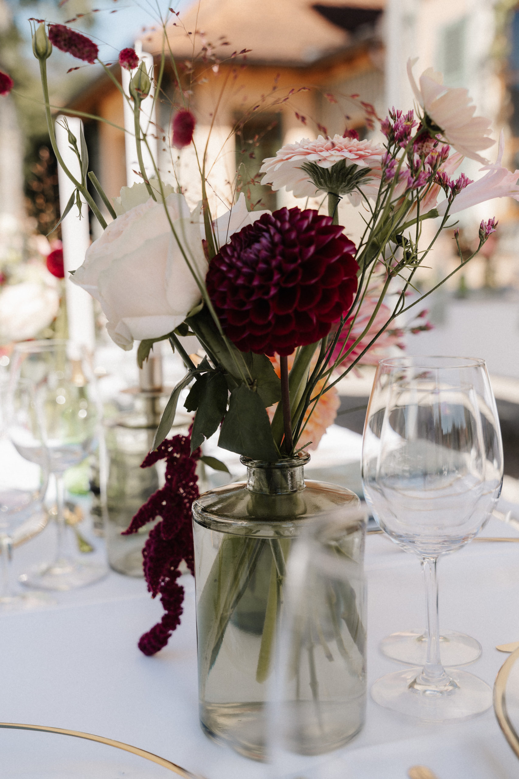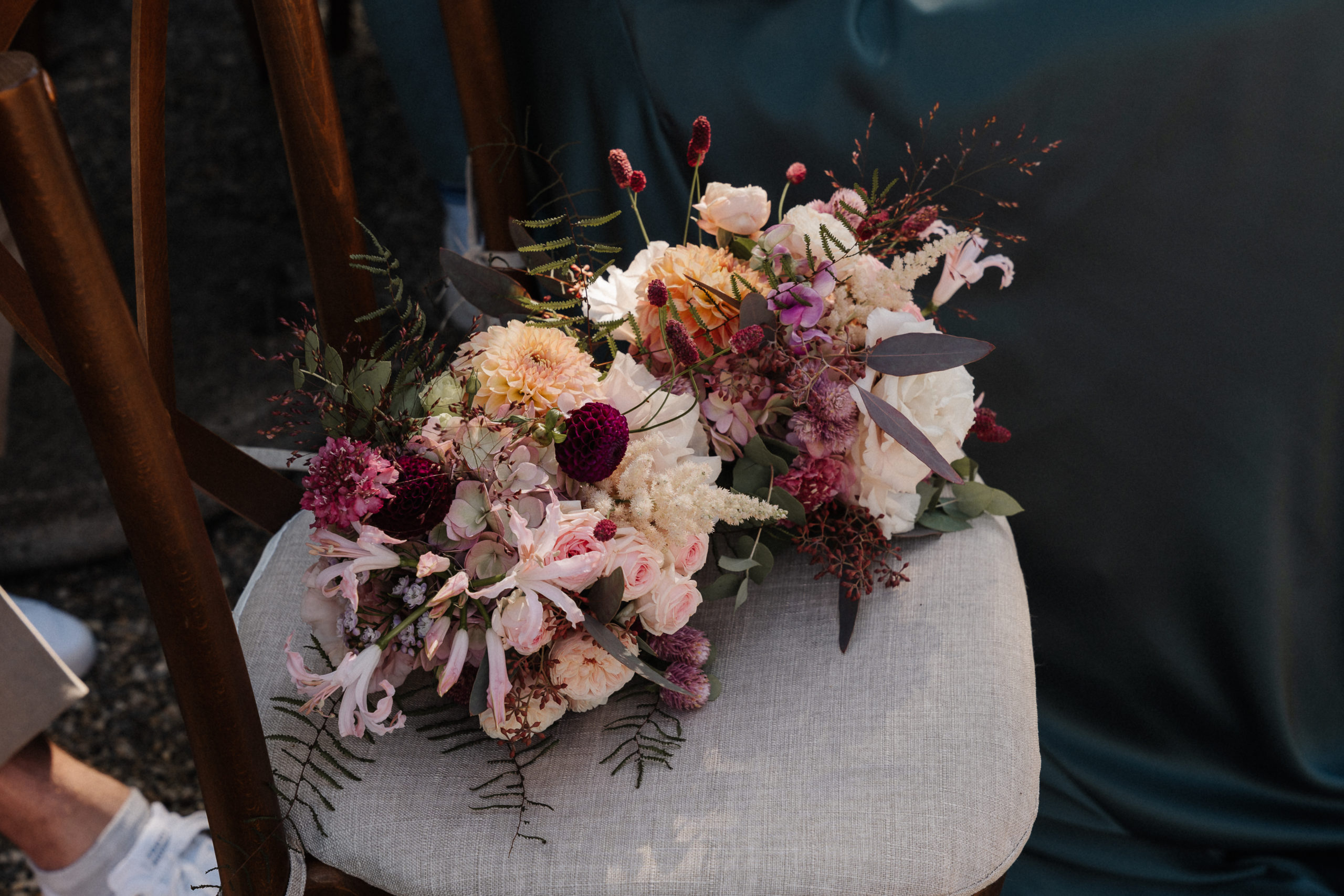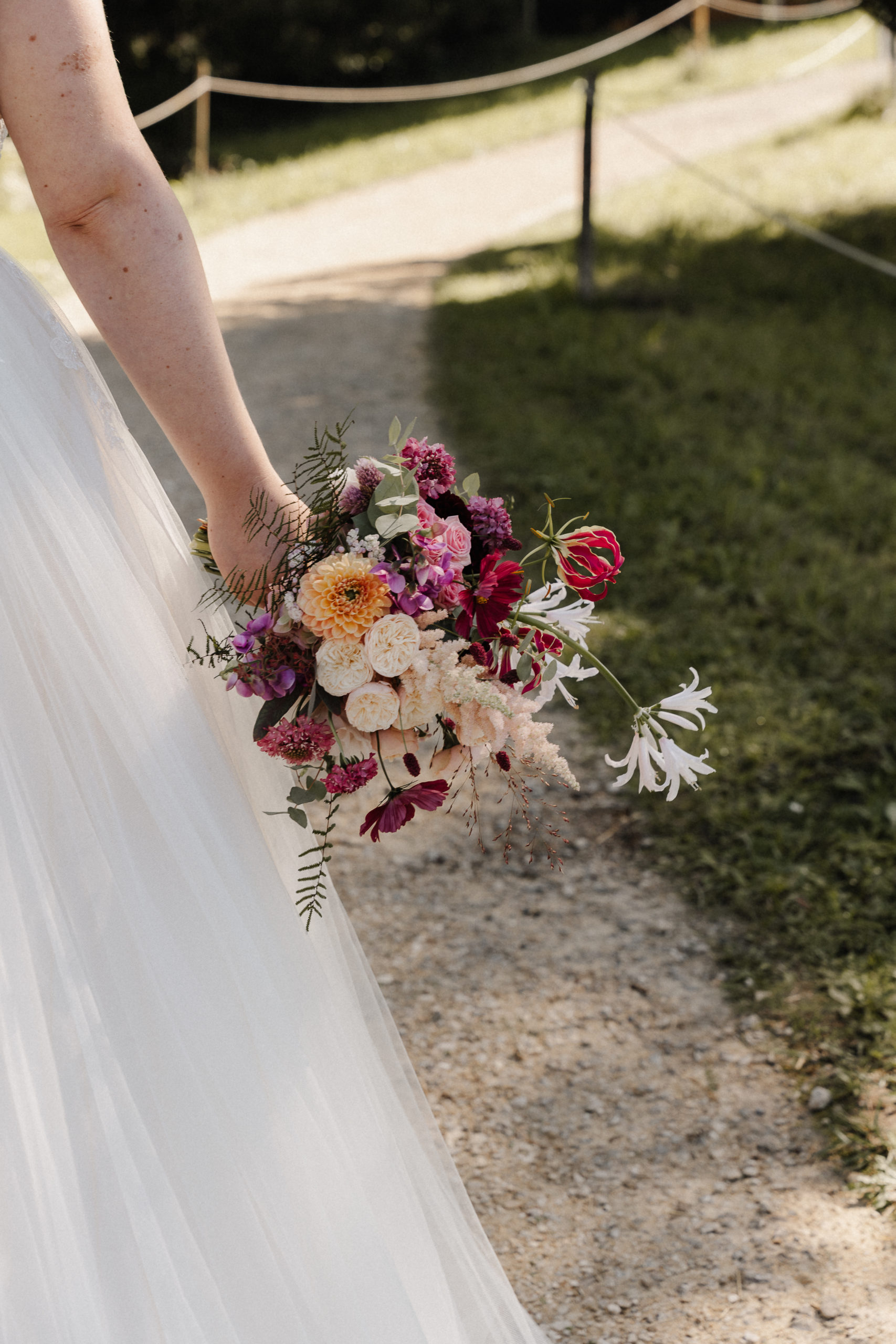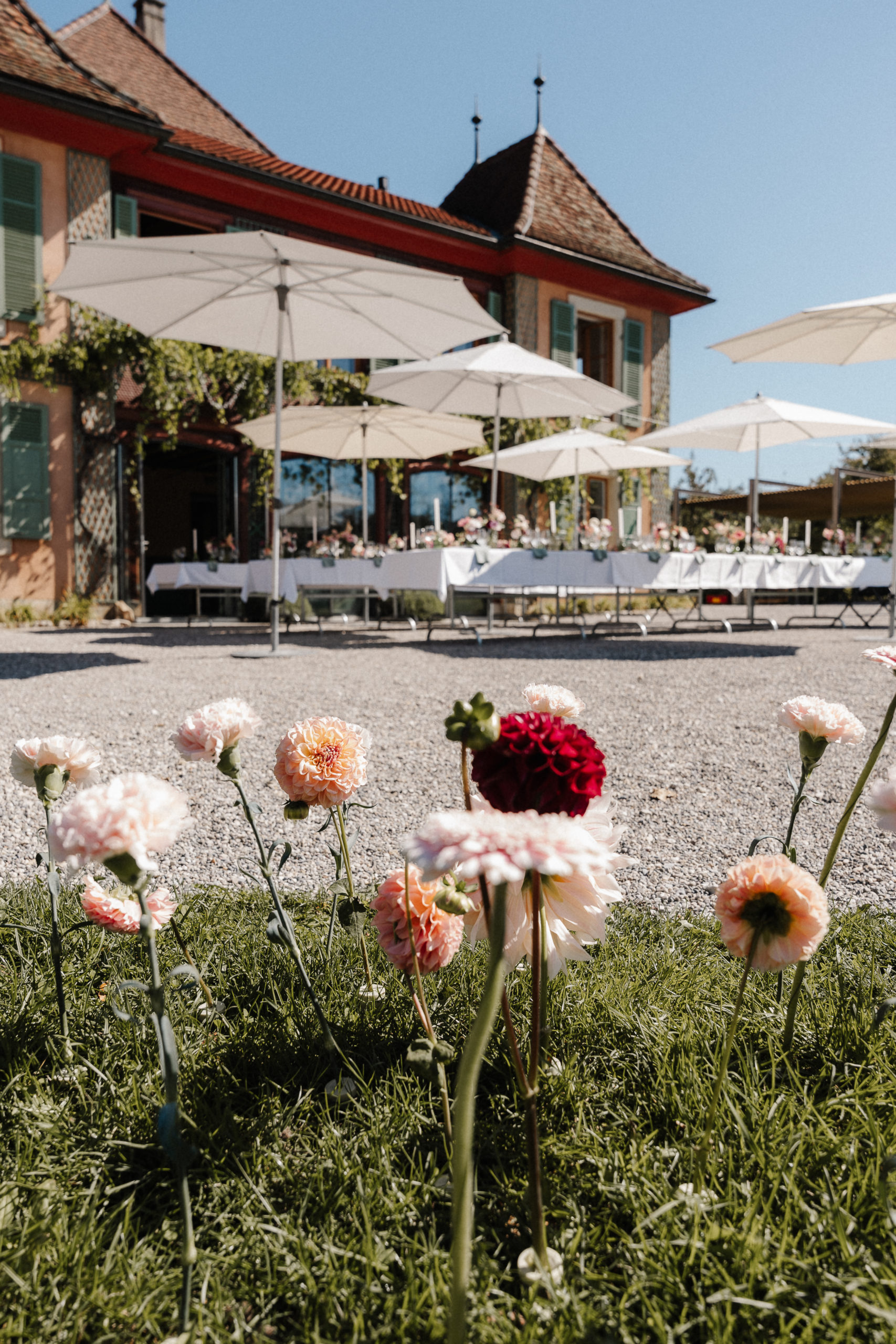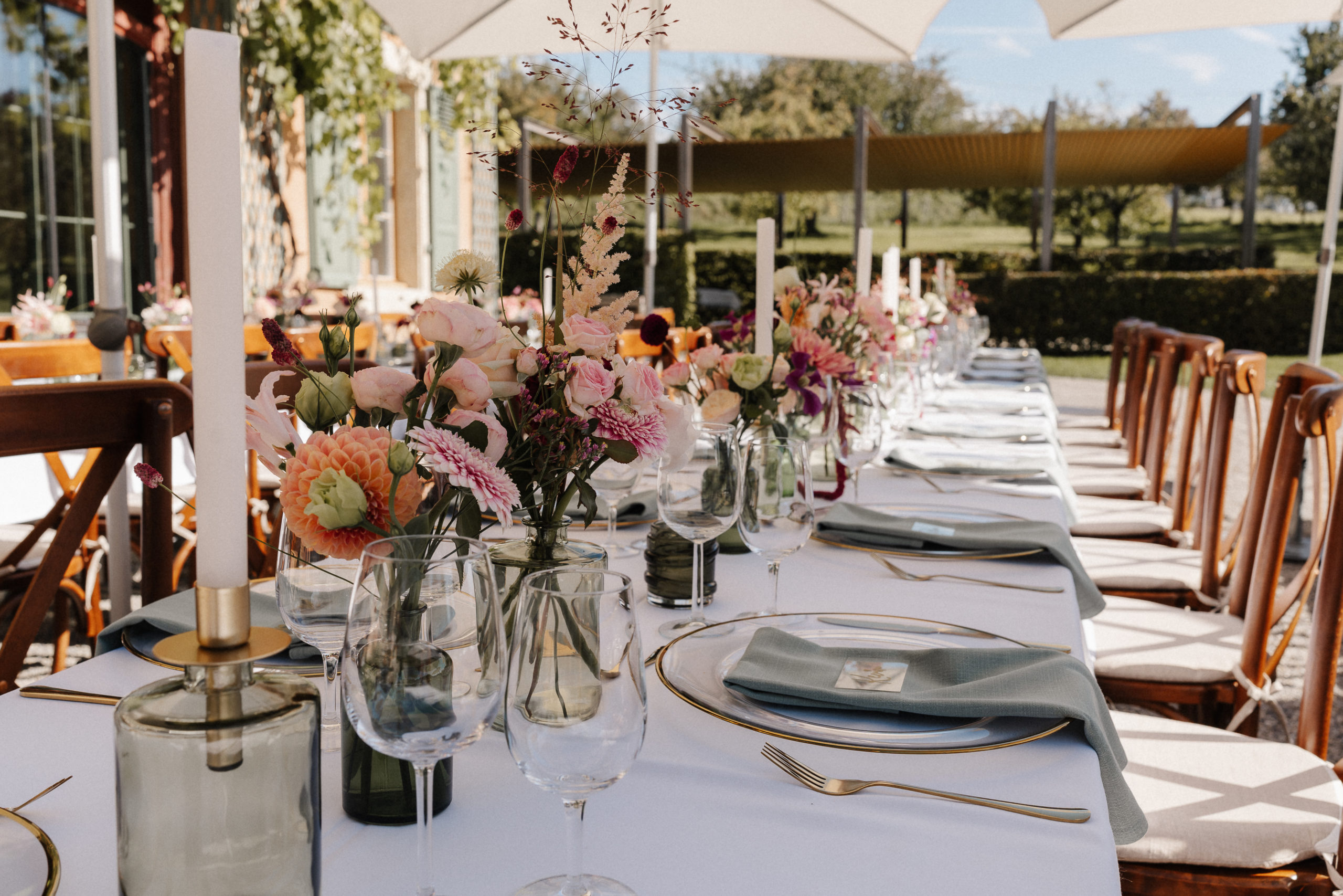 Bei dieser Hochzeit haben wir speziell darauf geachtet, dass sich die Farben der Hochzeitsfloristik mit den Farben der Location vereint. Zudem war der Wunsch der Brautpaares, möglichst saisonale Blumen zu nutzen.